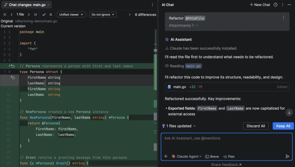 Claude นั้นเป็นเอเจ้นต์ตัวแรกที่ทำงานได้แนบเนทีฟกับ GoLand และตอนนี้ก็ได้เพิ่มความสามารถที่จะเไปเชื่อมกับ Junie และ อาจจะถามทั้งสองเอเจ้นต์ได้พร้อมกัน