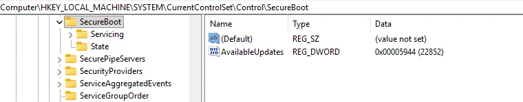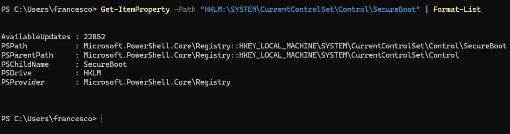 Get-ItemProperty -Path "HKLM:\SYSTEM\CurrentControlSet\Control\SecureBoot" | Format-List
